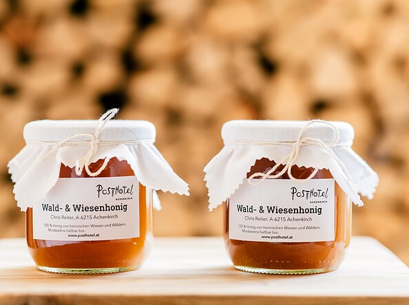 Von unseren benachbarten Almen beziehen wir Milch, Butter, Kalb-, Lamm- und Rindfleisch sowie Speck. Am hoteleigenen Golfplatz betreiben wir eine Damwild-Aufzucht. Käse liefern uns regionale Bauern, der Honig stammt in Teilen von unserem eigenen Bienenhof (der gleichzeitig dazu beiträgt, die heimische Ernte zu sichern) und frische Forellen und Saiblinge nach Verfügbarkeit aus dem wenige Meter entfernten Achensee. Viel Gutes stellen wir auch selbst her, so zum Beispiel einige unserer Marmeladen, Nudeln und das Brot nach hauseigenem Rezept. Letzteres beziehen wir teilweise auch von der benachbarten Mühlenbäckerei Adler. Auch in unserem TCM-Restaurant verwenden wir vorwiegend regionale Produkte. Das kristallklare, erfrischende Wasser stammt aus der nahen Bergquelle.