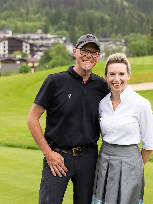Barbara und Manuel tragen die Verantwortung für den Posthotel Alpengolfplatz: Manuel sorgt draußen dafür, dass die Anlagen und Greens stets in perfektem Zustand sind, während Barbara mit sicherer Hand Startzeiten und Kurse koordiniert, sodass alles wie am Schnürchen läuft.