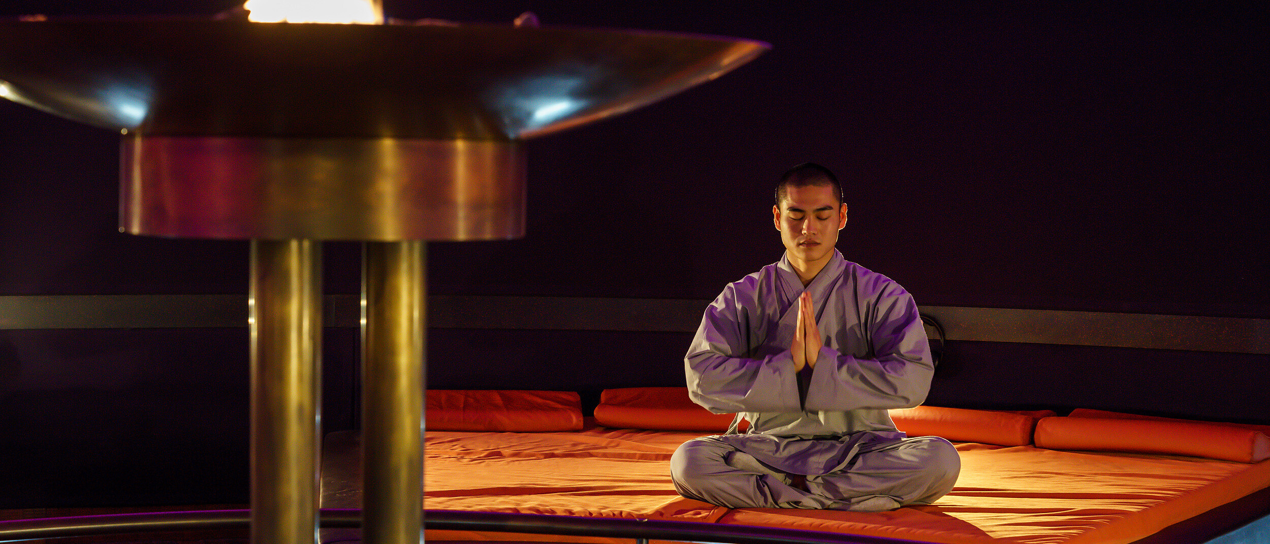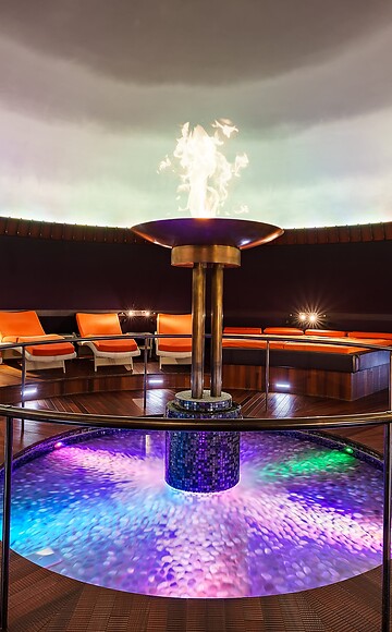 Kehren Sie zurück in den Schoß von Mutter Erde – das Zentrum des Versunkenen Tempels ist ein kreisrunder Meditations- und Ruheraum unter einer gläsernen Kuppel. Lassen Sie sich auf den Liegen oder Wasserbetten nieder und die Atmosphäre des Raumes auf sich wirken. In seiner Mitte lodert ein metallener Feuerkelch, der von einem Brunnen mit geheimnisvollem Lichtspiel umgeben ist.