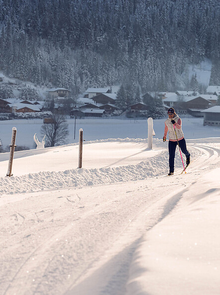 Cross-country skiing is a particularly holistic endurance training that activates nearly all major muscle groups simultaneously. The flowing movements of arms and legs engage the entire body without overloading it. This protects the knees and back while stabilising and strengthening the core muscles. Exercise in the fresh winter air also improves circulation, strengthens the immune system, and reduces stress. Cross-country skiing in the Achental region is the ideal winter sport to combine physical fitness with the freedom of experiences in nature.