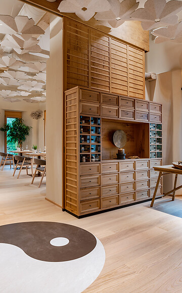 At Tenzo you can help yourself freely at the buffet. You will find a selection of salads, soups, hot and cold dishes (including vegetarian and vegan options) as well as desserts - all prepared using regional organic ingredients. Teas and spice blends not only refine the dishes but are an essential part of TCM cuisine and valued for their medicinal benefits. If you would also like to enjoy our TCM cuisine in the evening, we will serve you a corresponding 3-course menu in the gourmet main restaurant.