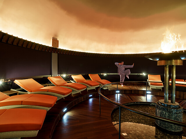 At the centre of the temple lies the round meditation room beneath a glass dome. Soft light, fine materials and clean lines create an atmosphere that invites inner balance. Waterbeds and a fire chalice, relaxation areas and three cosy nest-like retreats provide comfort and strength.