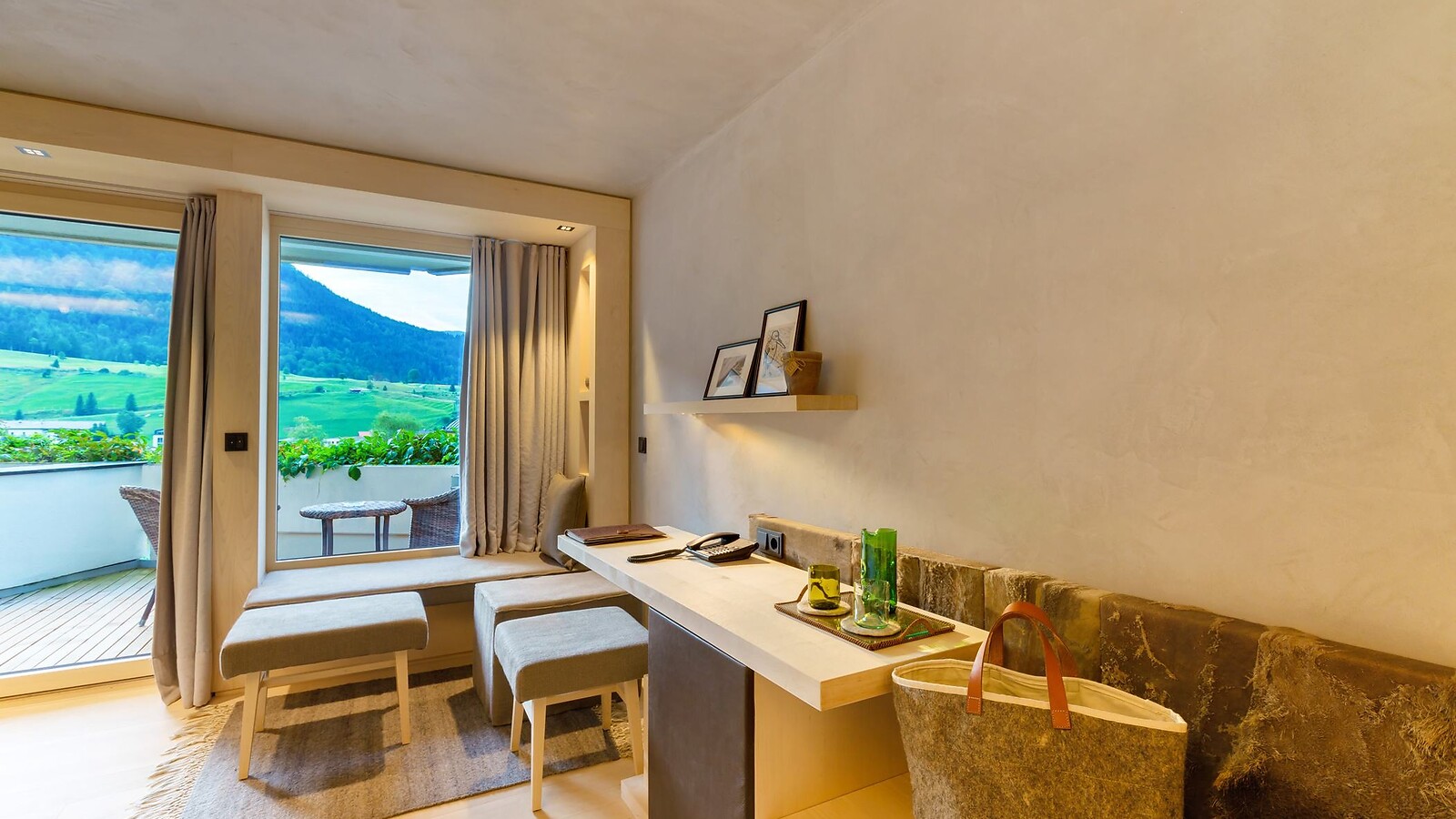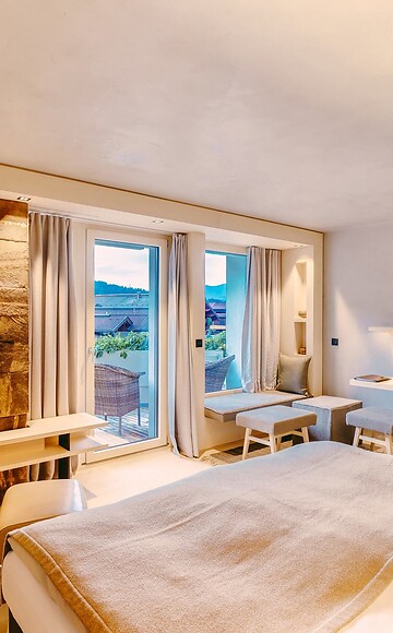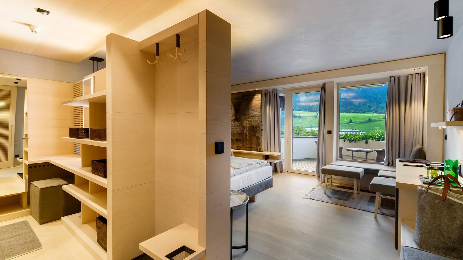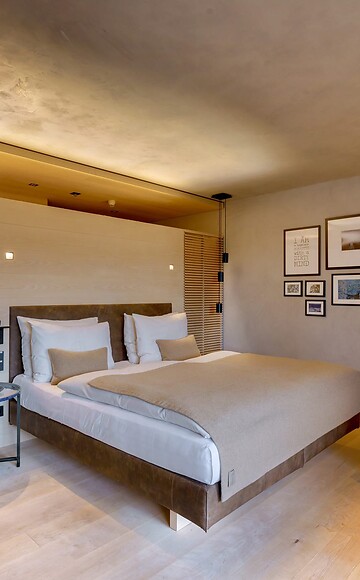 Light wood and a huge walk-in wardrobe give the room its elegance. The integrated melatonin lighting ensures optimal sleep in the “Auszeit” room.
