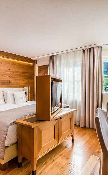 The rustic reclaimed wood, along with pictures of mountaineering scenes, gives the room its cozy charm.