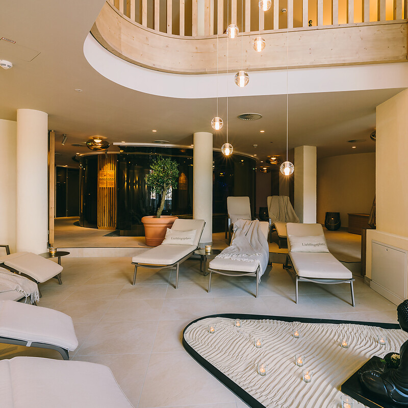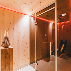 Outdoors you will find our Karwendel Fire Sauna at 90 °C with regular infusions for an exceptional sauna experience. Healing infrared radiation awaits you in the Swiss pine infrared chamber and in the salt room, where salt is nebulised ultrasonically at 35-40 °C (salt content 5%).